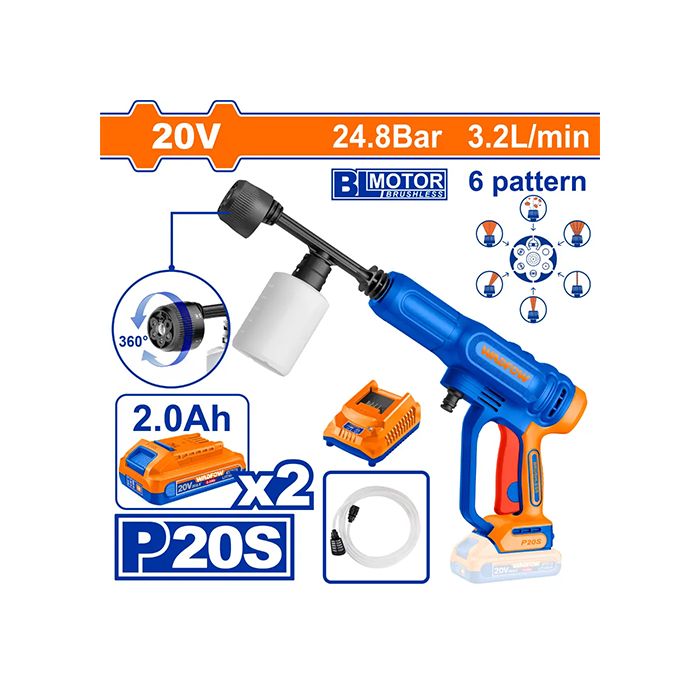 - 20 V brushless motor — efficient and durable, delivering reliable water pressure for effective cleaning tasks.