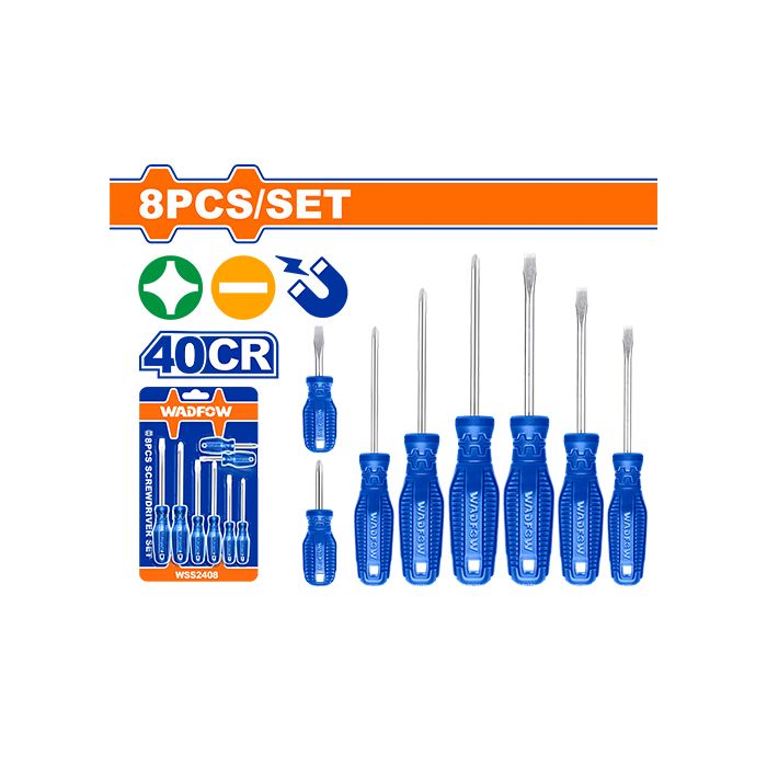 The Wadfow WSS2408 8-Piece Screwdriver Set is a comprehensive hand-tool solution designed for precise screwing, loosening, and tightening of slotted and Phillips screws in electrical, mechanical, and DIY applications. Built for durability, versatility, and comfort, this set is ideal for professional technicians, electricians, and home users.