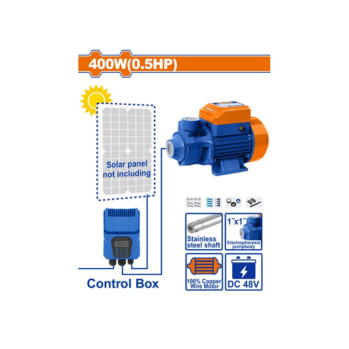 The Wadfow WWPVDC01 Solar Water Pump is an energy-efficient and eco-friendly pumping solution designed for off-grid water supply, irrigation, and remote installations. Powered by 48V solar input and a 400W (0.5HP) copper wire motor, this pump delivers reliable performance with a maximum head of 44 meters and a flow rate of up to 40L/min. Built with a stainless steel shaft, brass impeller, and electrophoresis-coated pump body, it offers excellent durability and corrosion resistance for long-term outdoor use.